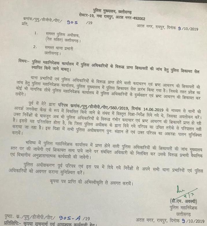 पुलिस महानिदेशक डीएम अवस्थी ने दुख जताते हुए कहा कि पिछले पत्रों के माध्यम से थानों को आदर्श जनसेवा केंद्र बनाने के संबंध में दिशा-निर्देश दिए गए थे, लेकिन उक्त निर्देशों के बावजूद अब भी पुलिस अधिकारियों के विरुद्ध गंभीर कदाचरण एवं शिकायतें प्राप्त हो रही है. इससे यह परिलक्षित होता है कि जिला पुलिस अधीक्षक के द्वार दिए गए परिपत्र का उचित तरीके से परिपालन नहीं कराया जा रहा है. इस दिशा में सभी पुलिस अधीक्षक पुन: संज्ञान ले एवं उक्त परिपत्र का पालन सुनिश्चित कराएं.