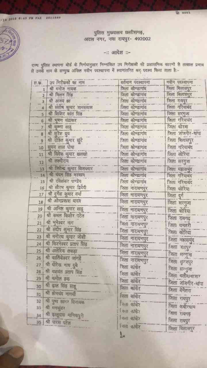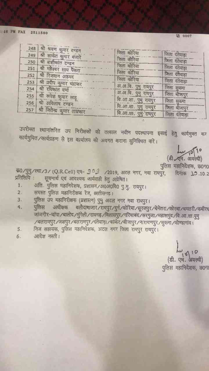 रायपुर, 10 अक्टूबर 2019, लिस्ट में रायपुर समेत बस्तर संभाग के सभी जिले के अलावा बलौदाबाजार, कबीरधाम, धमतरी के अलावा अन्य जिले में पदस्थ उपनिरीक्षकों का तबादला किया गया है। डीजीपी डीएम अवस्थी ने लिस्ट जारी कर दी है।