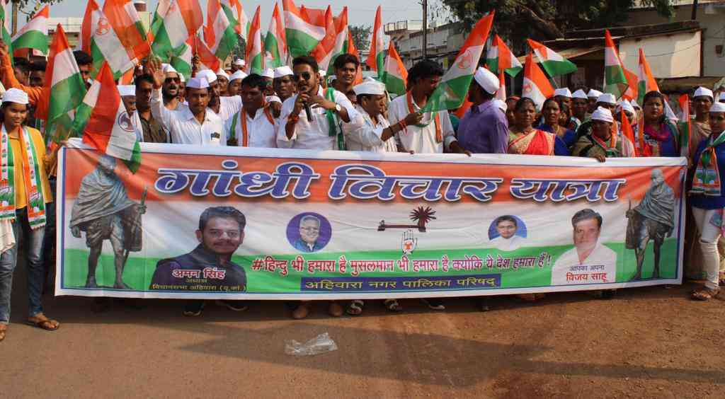 दुर्ग जिले के ग्राम अहिवारा में गांधी विचार पदयात्रा किया गया। यह पदयात्रा यूथ कांग्रेस अध्यक्ष अहिवारा अमनदीप के नेतृत्व में निकाली गई। इस पदयात्रा में शामिल लोग सर पर गाँधी टोपी धारण किये हुए थे। इस यात्रा में कांग्रेस पार्टी के पीएचई मंत्री रूद्र गुरु शामिल हुए। पदयात्रा वार्ड क्रमांक एक संतोषी मंदिर से लेकर वार्ड क्रमांक छ: के बस स्टैंड में समाप्त हुआ। उसके बाद एक आमसभा का आयोजन भी किया गया। मंच पर उपस्थित लोगों ने अपने अपने विचार रखे । पदयात्रा में भारी संख्या में लोग उपस्थित रहे। कांग्रेसियों का कहना है, कि बरसों से कांग्रेस पार्टी गांधी जी के विचारों पर चलते आ रही है। आज के युवा भी गांधी जी के विचारों पर चलते रहे। महात्मा गांधी के बारे में लोगों को जागरूक कर रहे हैं। आगामी नगरीय निकाय चुनाव को लेकर महात्मा गांधी के विचारों से ही प्रचार प्रसार किया जाएगा।